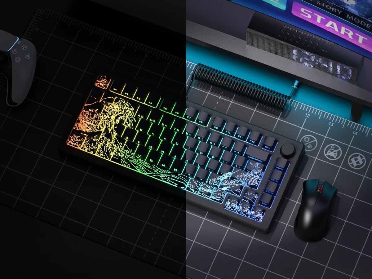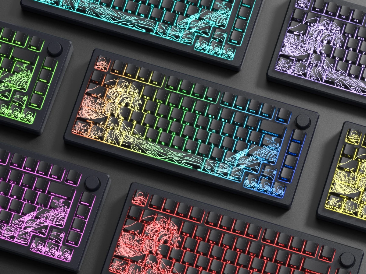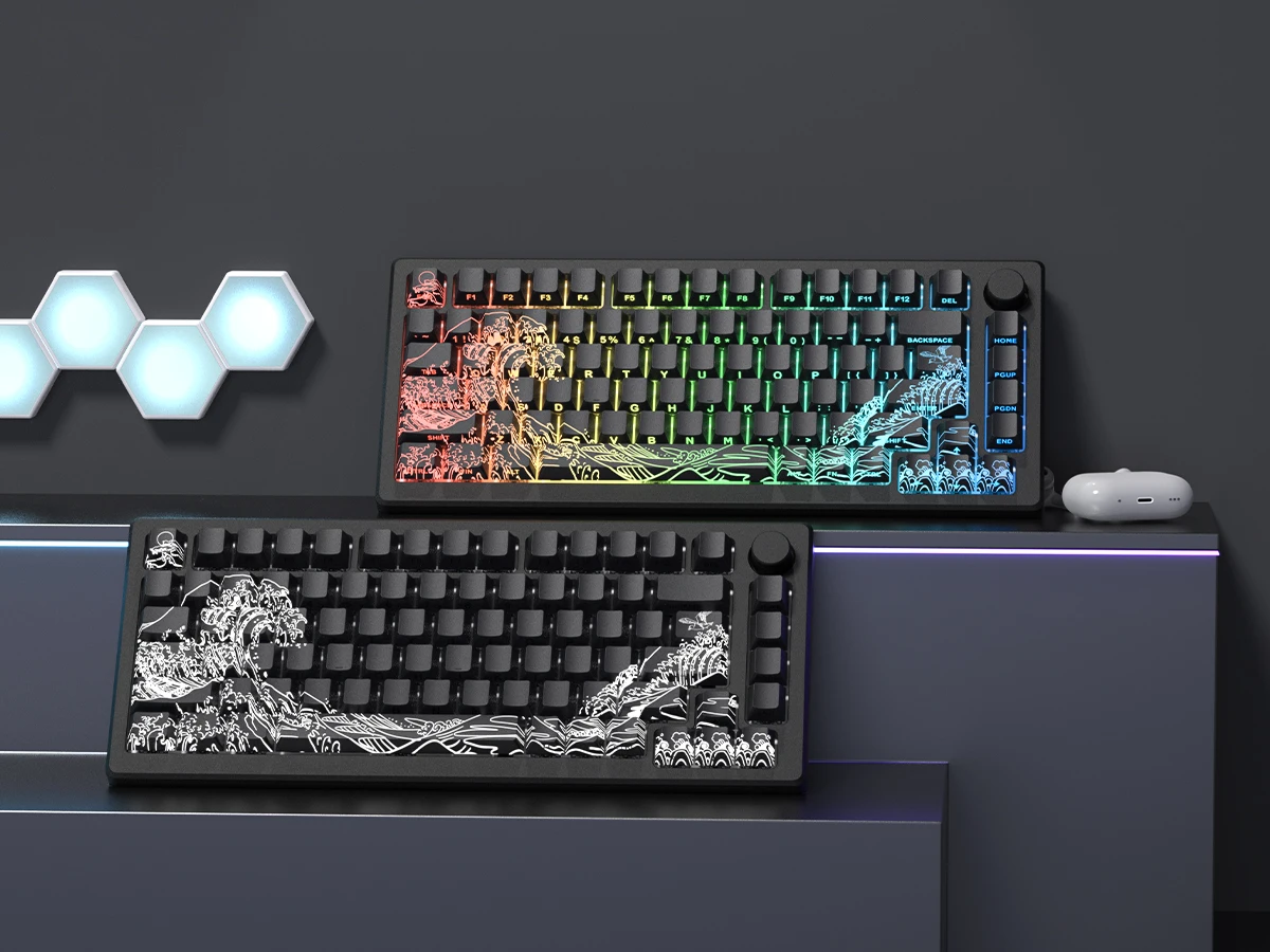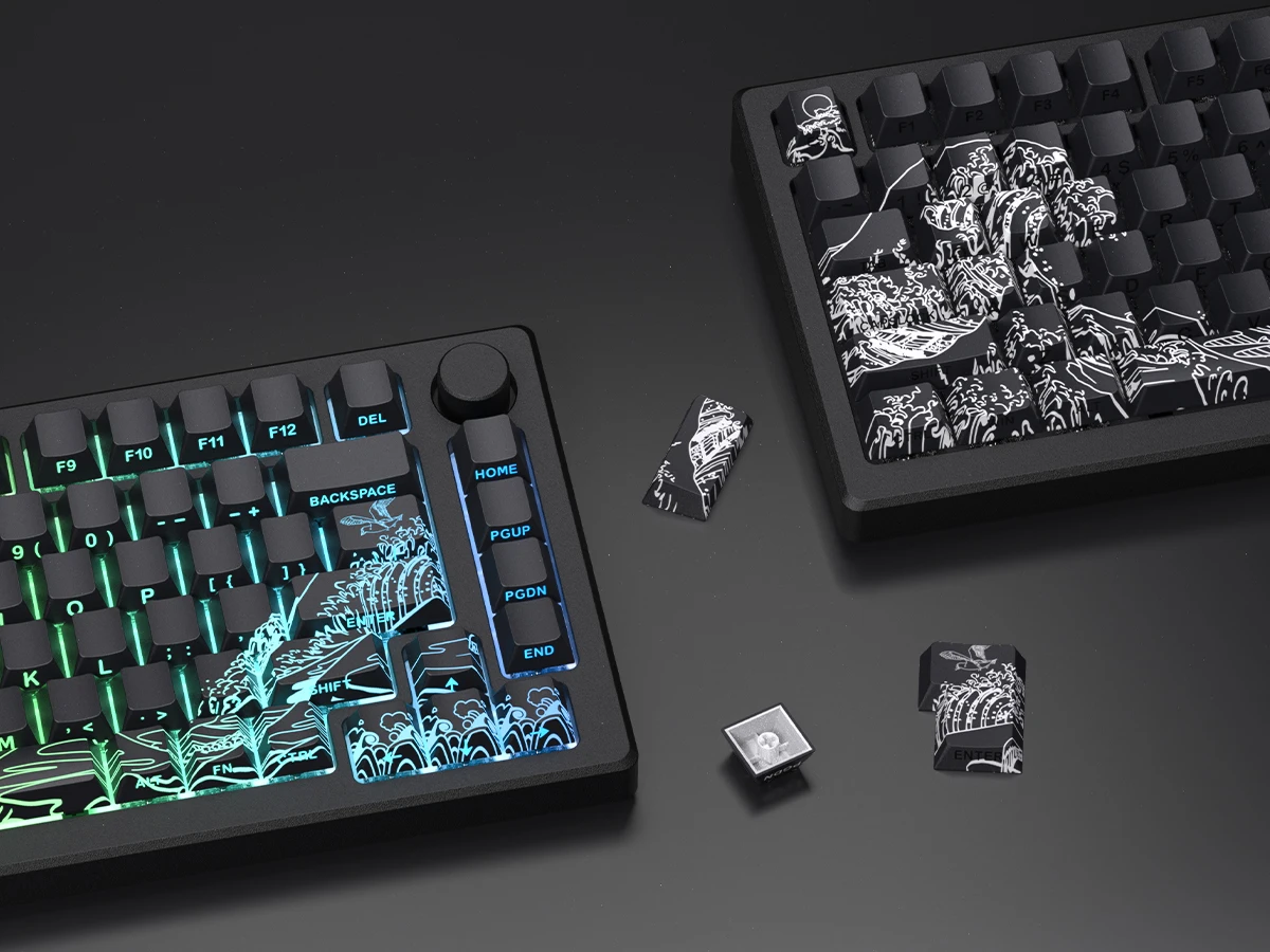 Black Kanagawa 2.0 Side Print Shine Through Keycaps 5 Sides Dye Sub PBT Keycaps Cherry Profile 134 Keys for MX Switches Keyboard